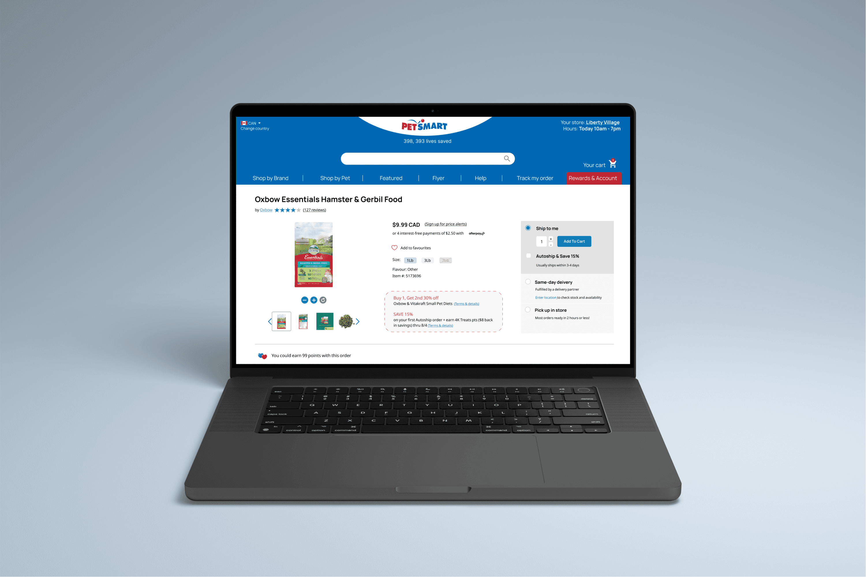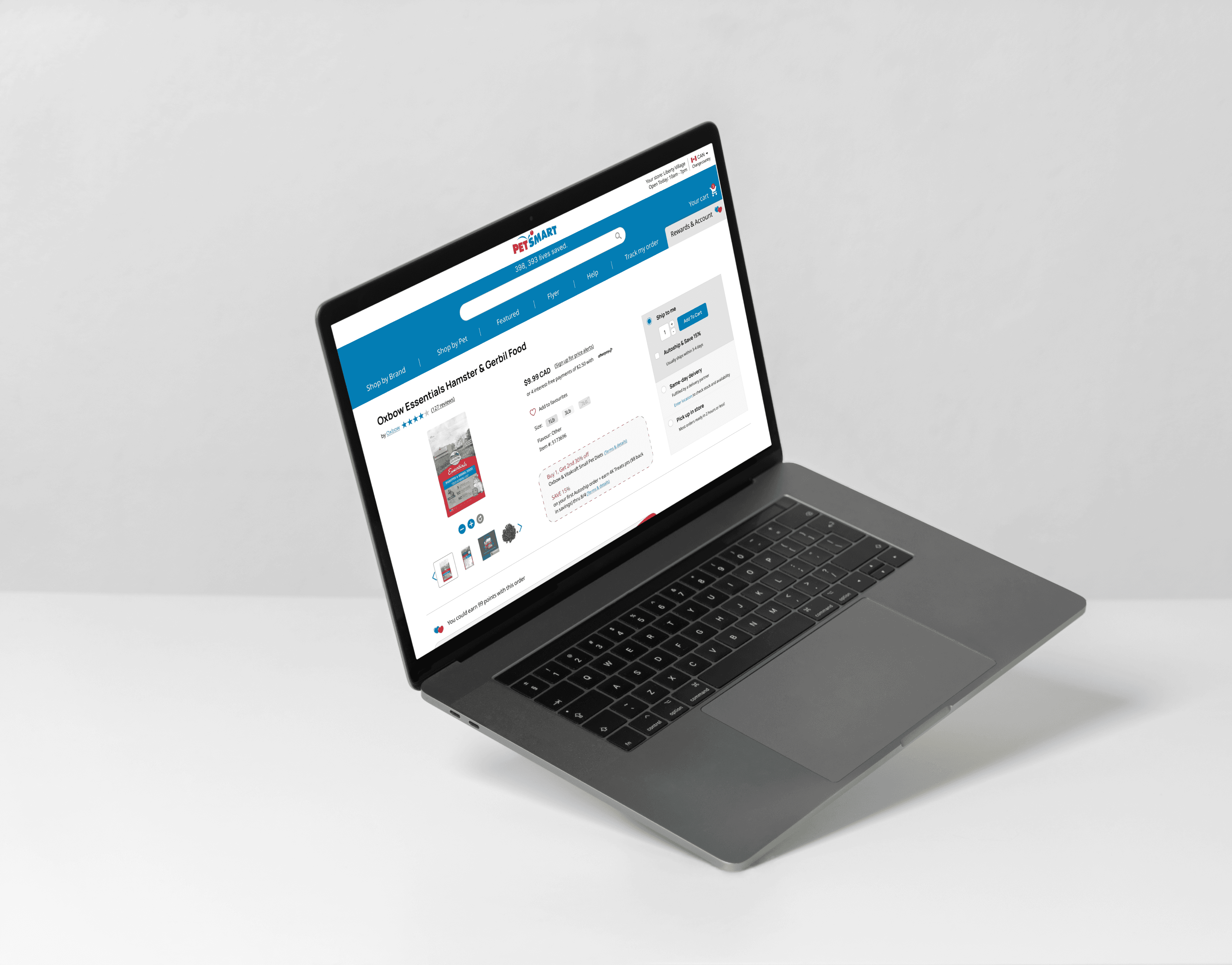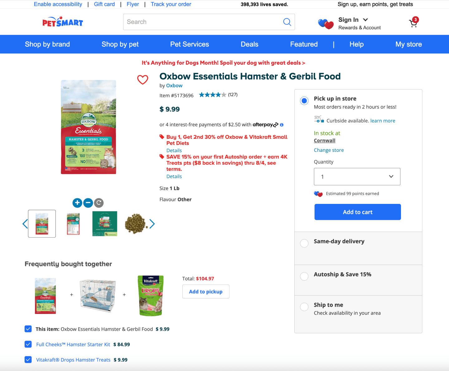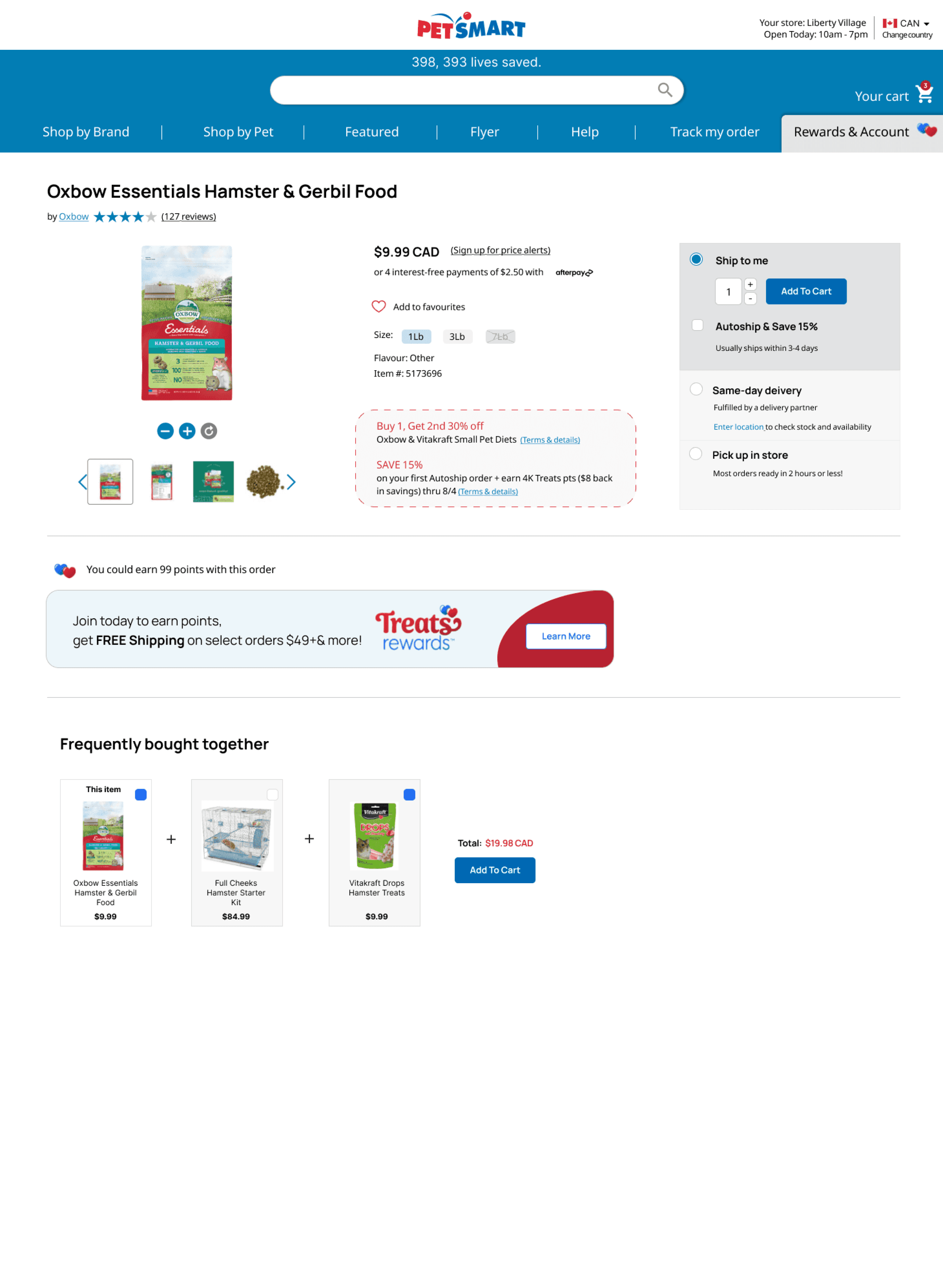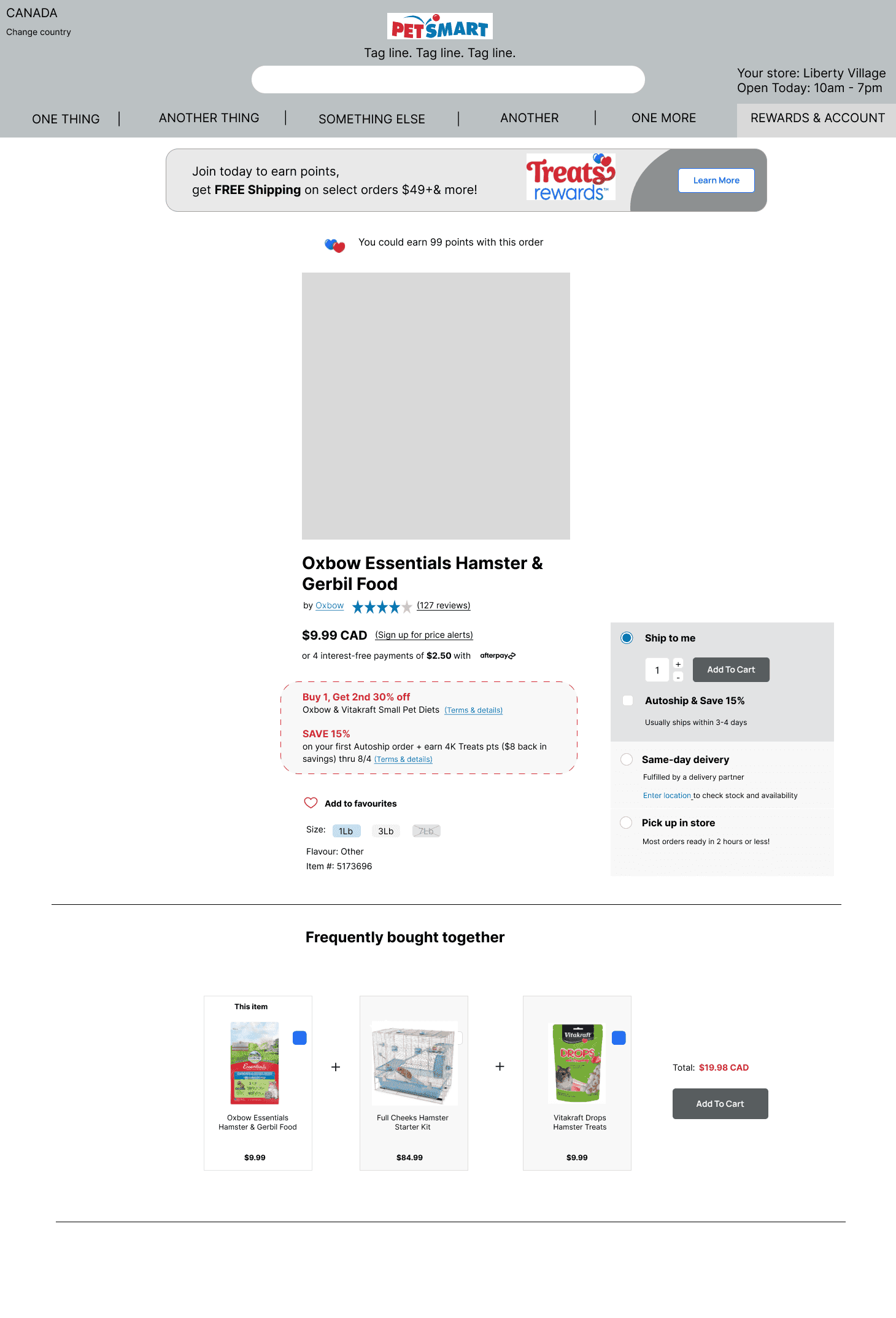 Initially, I have added a flag icon at the top bar along with "CAD" addition to all prices as indicators for users that they are in fact on a Canadian version of the site. Pet Smart has a US version which has a very similar look and feel, and some users mentioned often confusing the two and only realizing once at the checkout - understandably making it a frustrating experience.