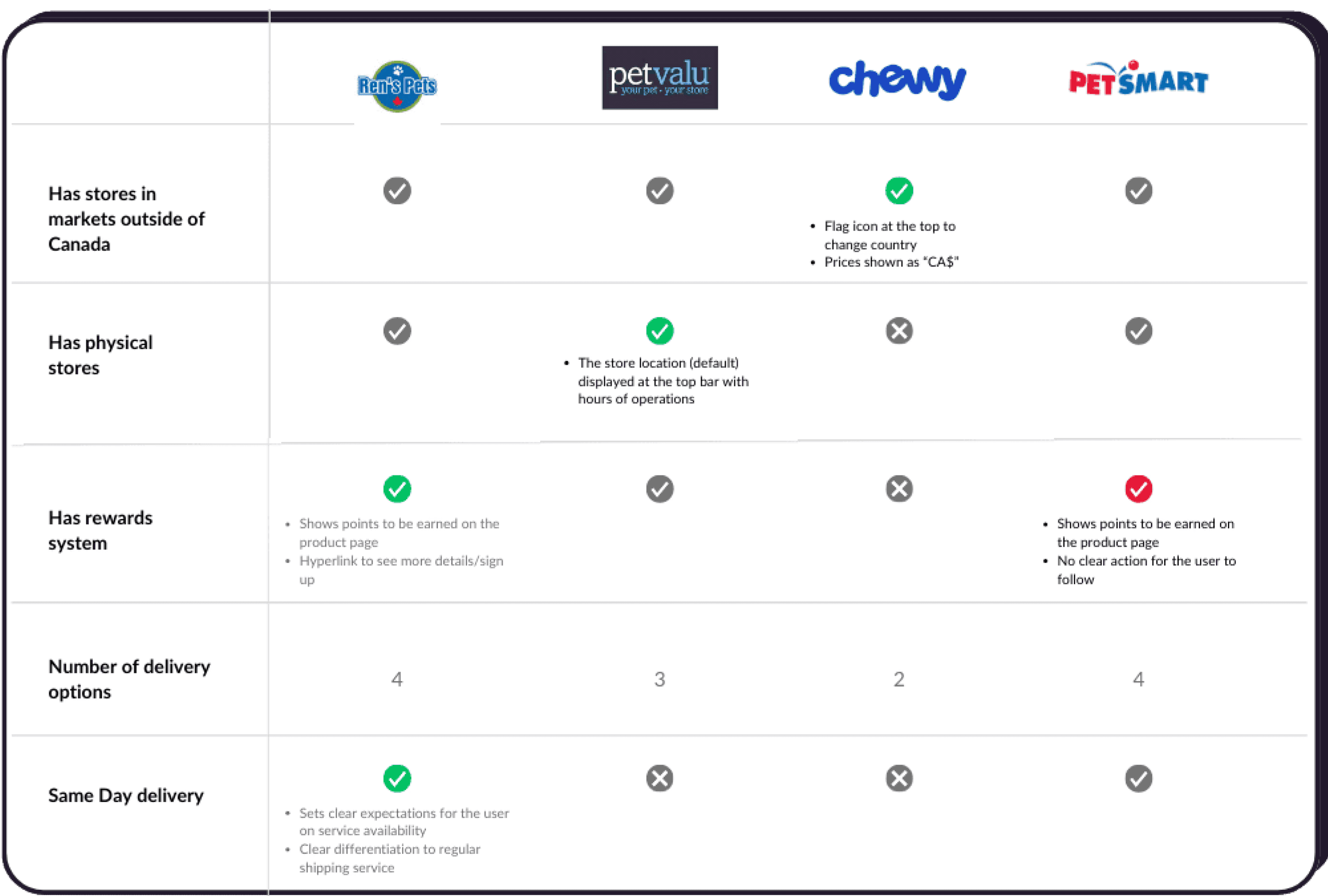 Next, I've used the pain points and features, that I have identified from Pet Smart's product page, to analyze specifically both the 'how' and the 'what' of the competitors. Namely, I first looked at whether the competitor even has a similar offering (marked with a grey tick or cross).