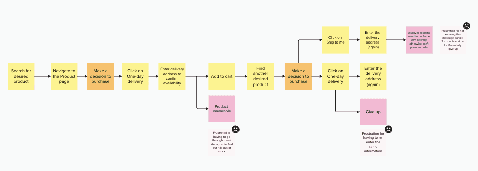 This is especially true for the Add-to-Cart and Checkout user flow. On the journey map above, I have identified a few areas of major frustrations for users (eg. where they are asked to re-enter the same information over and over again). Not solving these pain points can havea a direct negative impact on conversion rates, but it also means the company is currently running operations costs in resolving the aftermath of wrong orders.